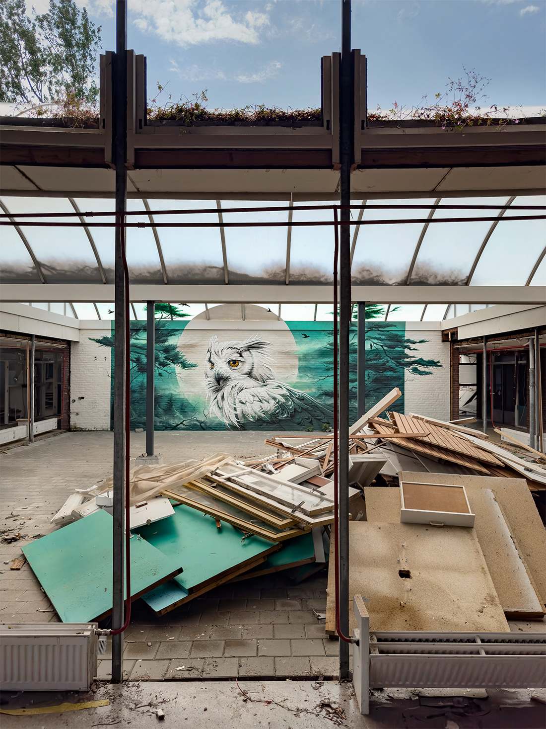 Even though the murals were destined to disappear with the announced demolition, I pulled out all the stops to make the most of the spaces, entirely at my own expense. The combination of the ever-decaying complex, the 'Abandoned Places' photography, and my own murals was utterly fascinating to undertake. The synergy was exceptional. Some people even said it was like having a street art museum in Purmerend, a hotspot of creativity.