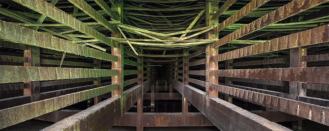 “A fantasy: beneath the abandoned tower, the dense maze of systematically placed concrete and wood could function as a dynamo or filter system for a large engine. The circular space above, which looks like a giant exhaust pipe, could function as a rocket starter. Instead of the cooled clouds that came from the cooling tower when it was active, it may be the heat from the launch of the rocket that is now producing tremendous clouds. It’s an unearthly construction that seems ready to take off any minute into space or even dive into a journey underground.”